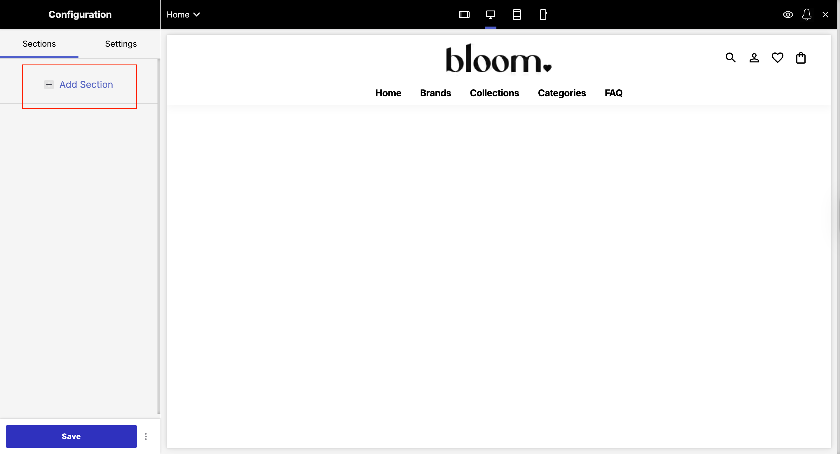 This tab is generally available when you are editing a page that supports sections, such as the homepage. Sections allow you to add, remove, or rearrange visual and functional blocks on the page. Each section can be customized with various elements such as banners, collections, or sliders.