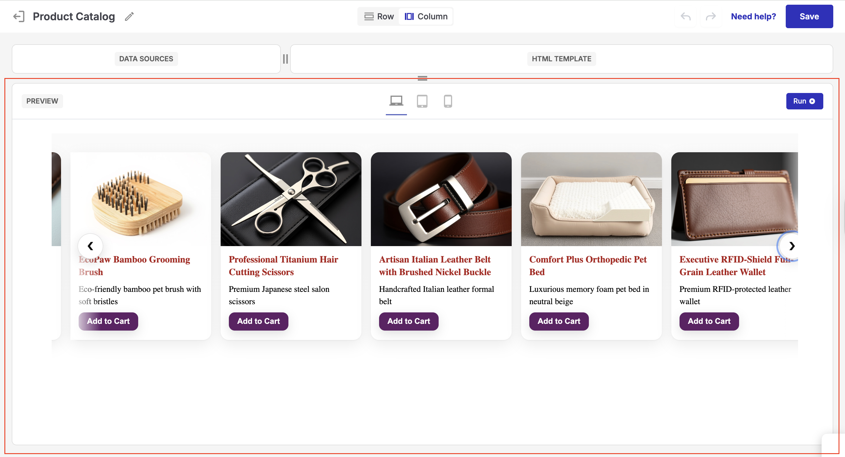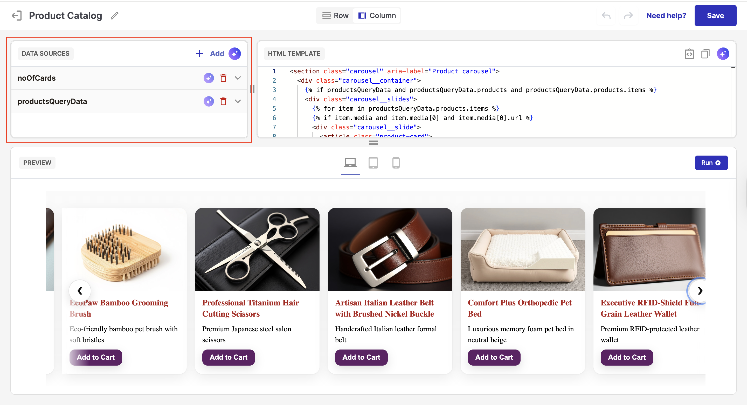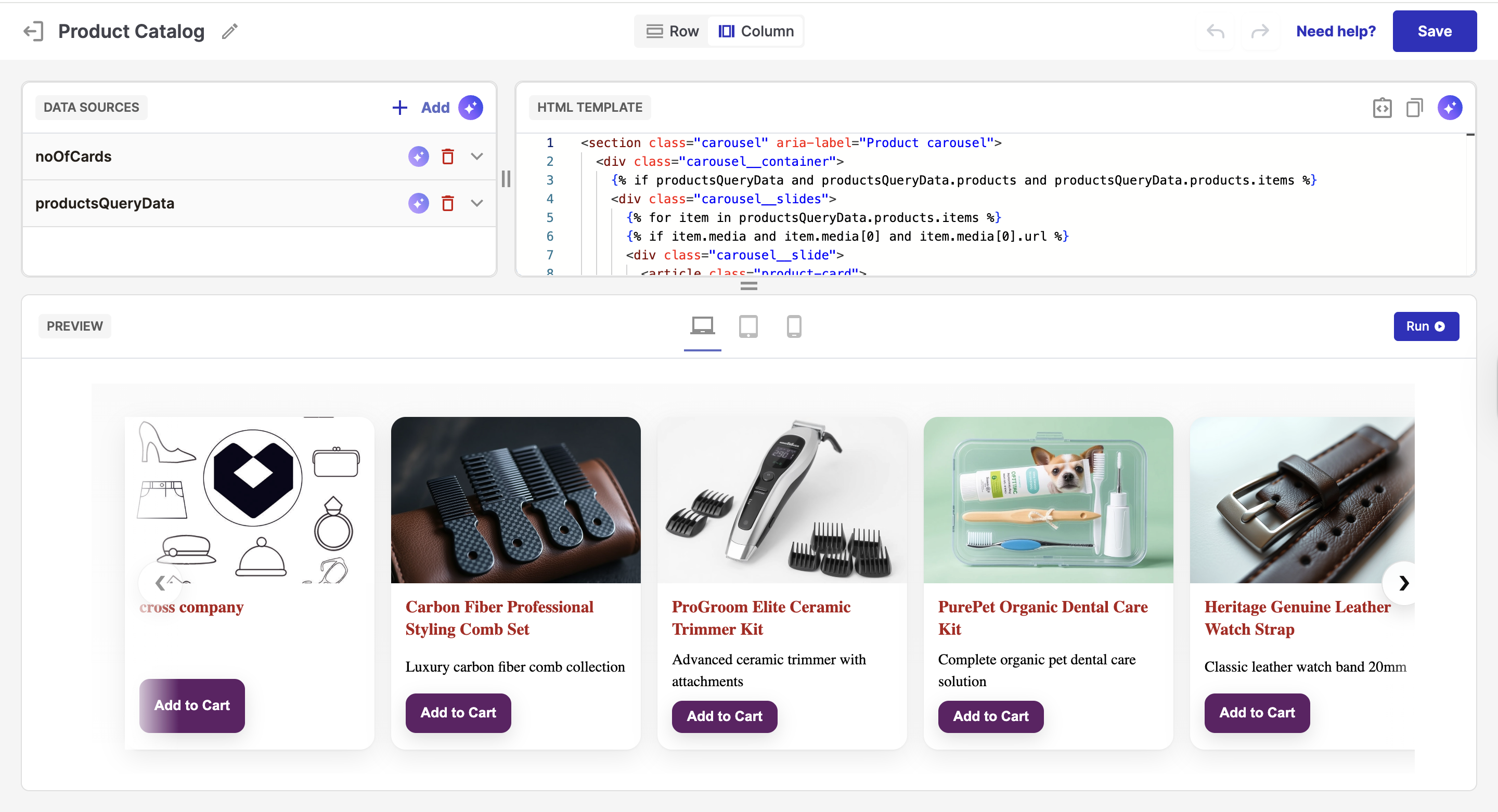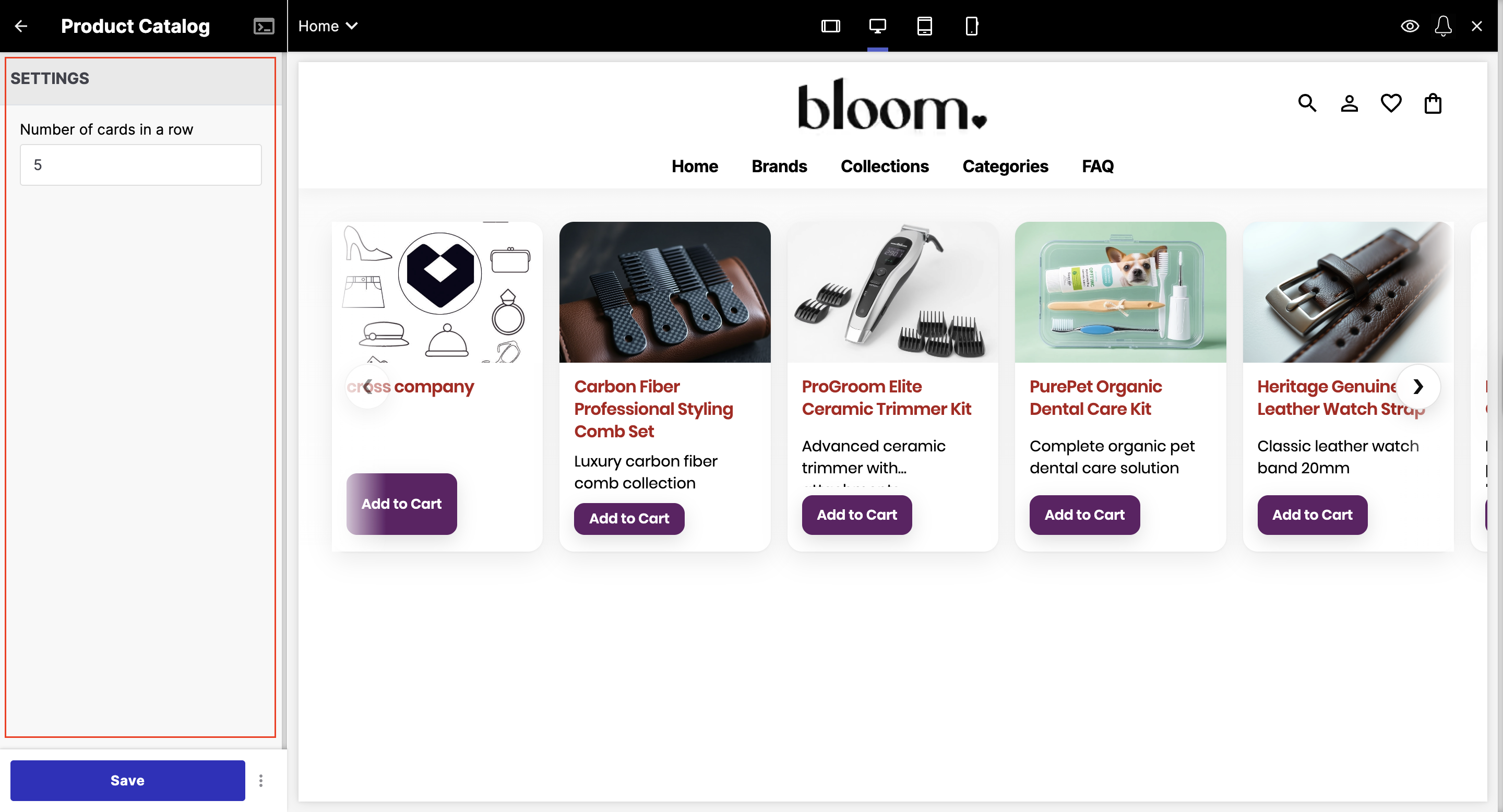 - No-code adjustments: Control layout and behaviour via configuration, for example cards per row, breakpoints, and pagination.