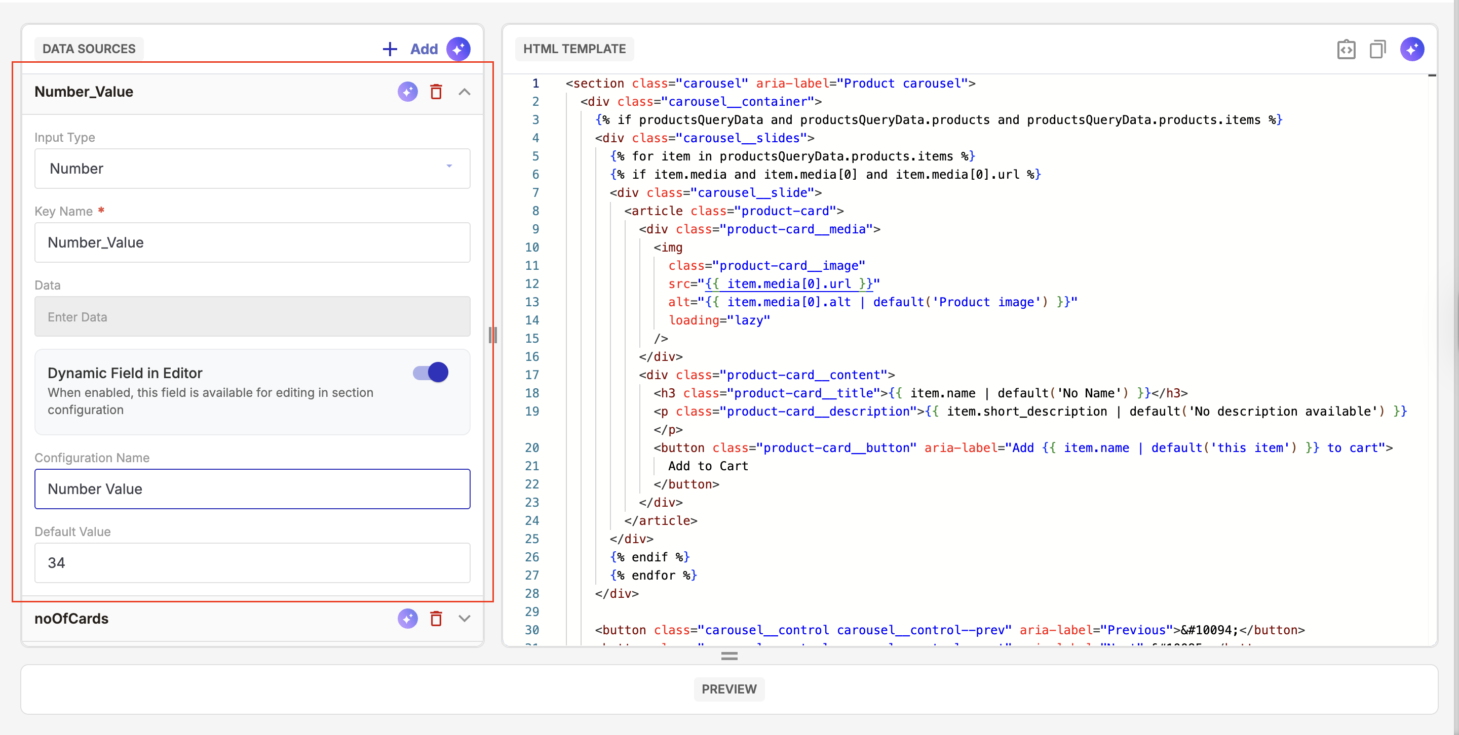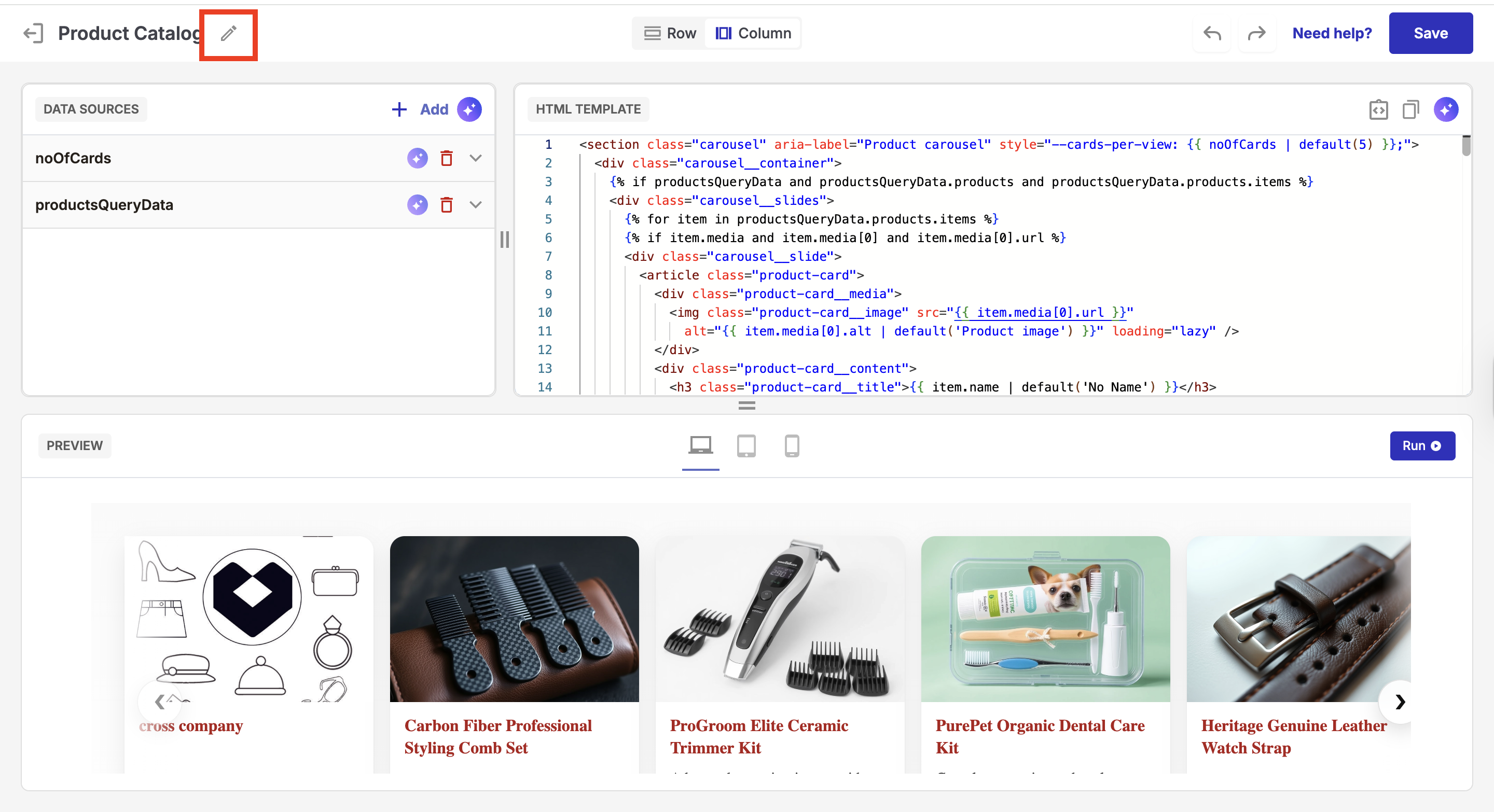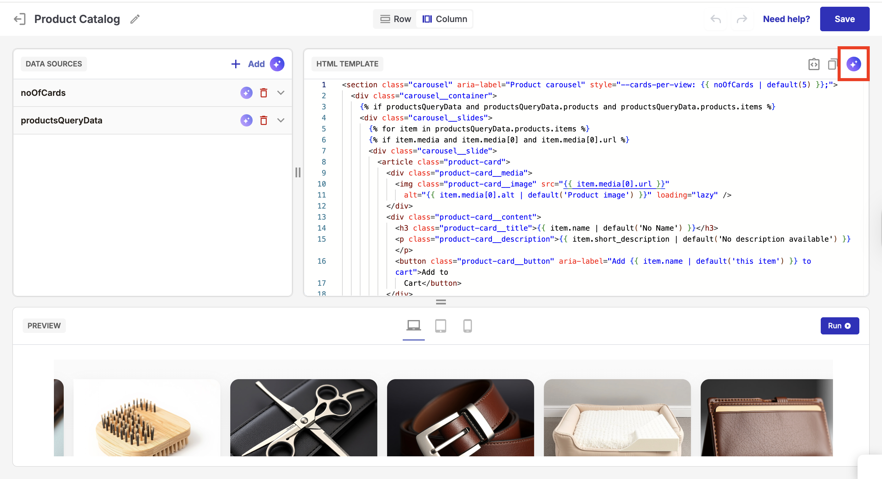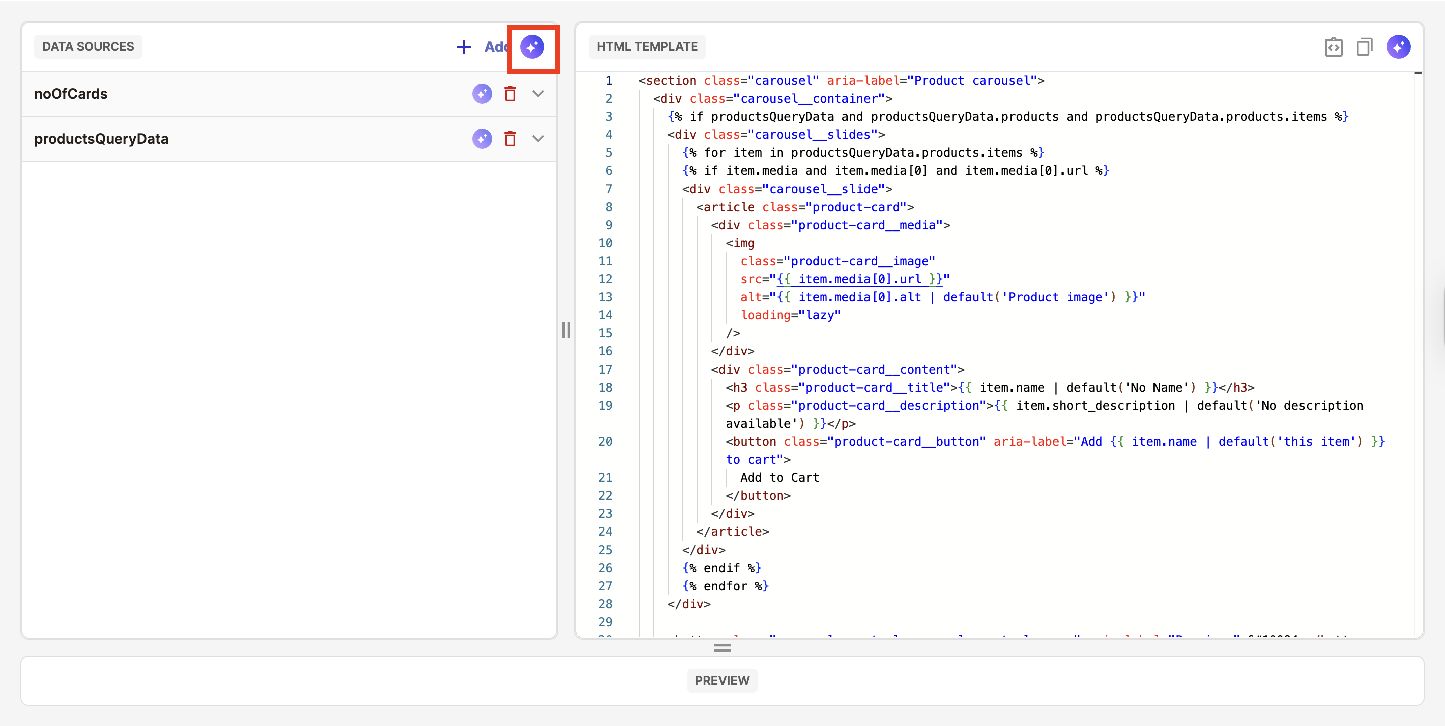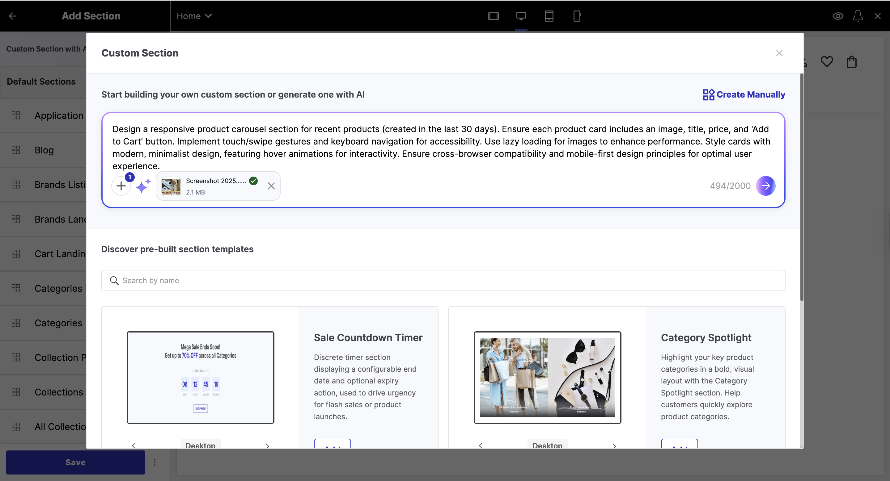 Merchants of all coding skill levels can create bespoke storefront page sections using AI from natural-language prompts with optional image guidance. Merchants with coding expertise can further refine the generated code or build sections from scratch using Nunjucks-based HTML templates and rich data sources.