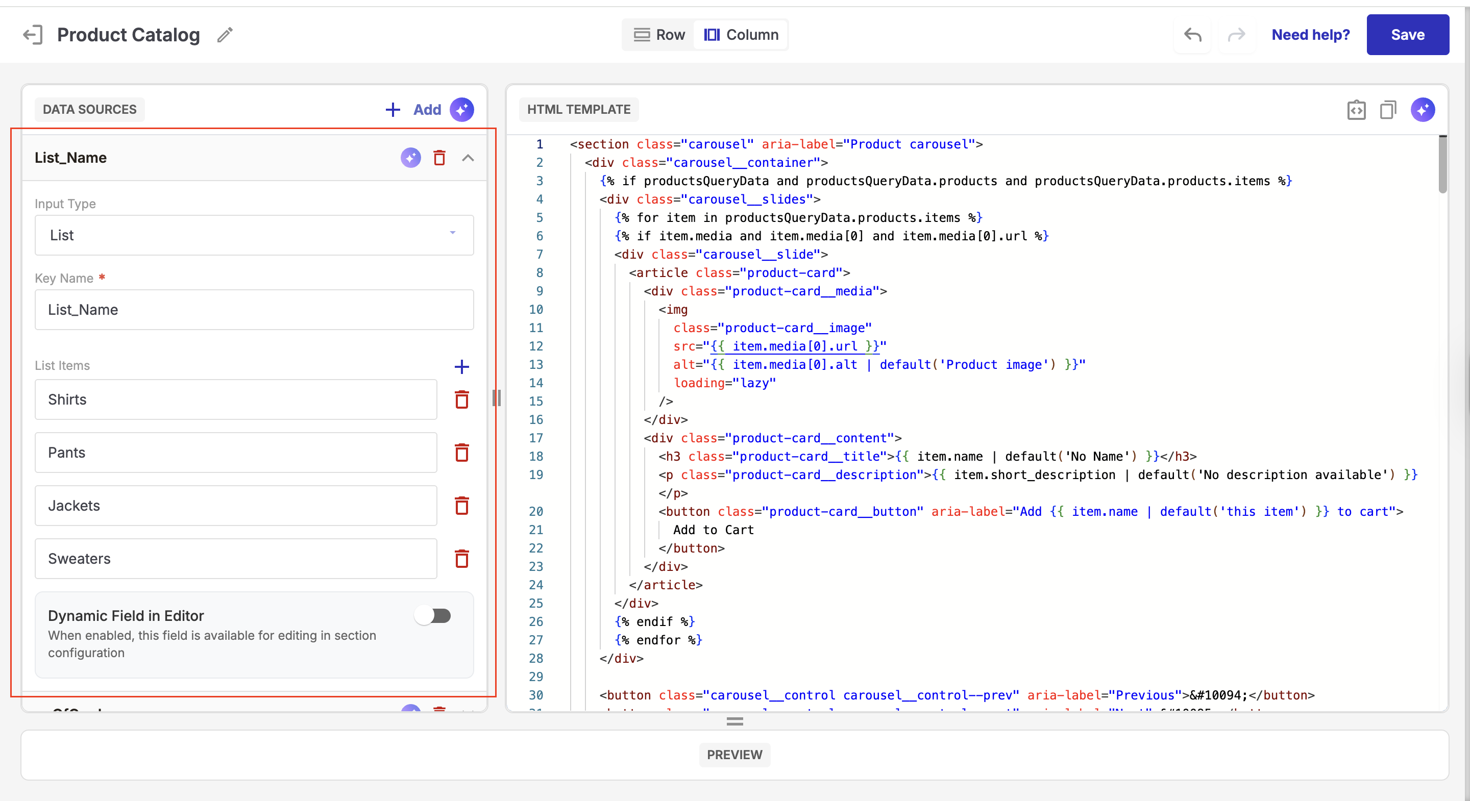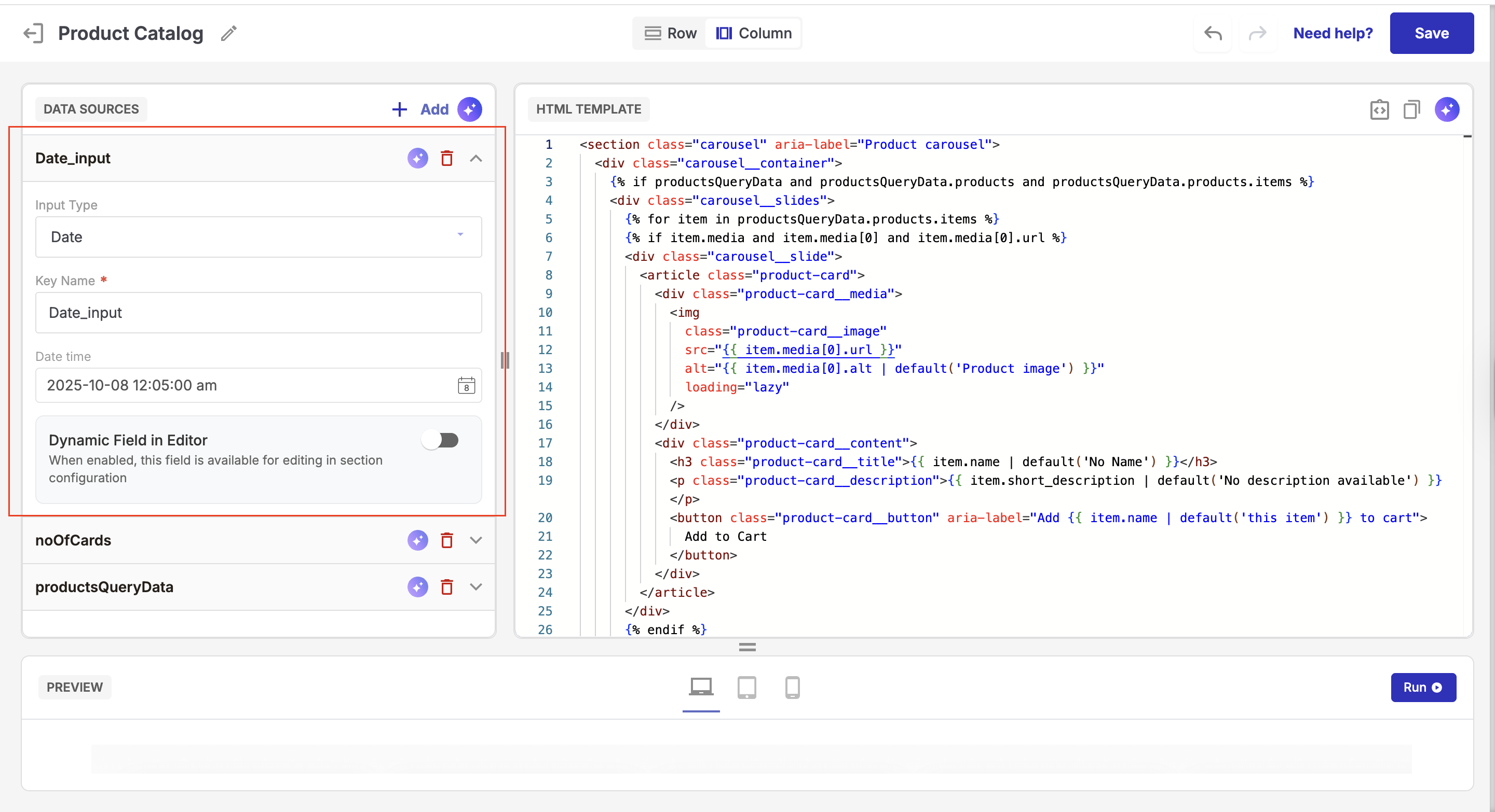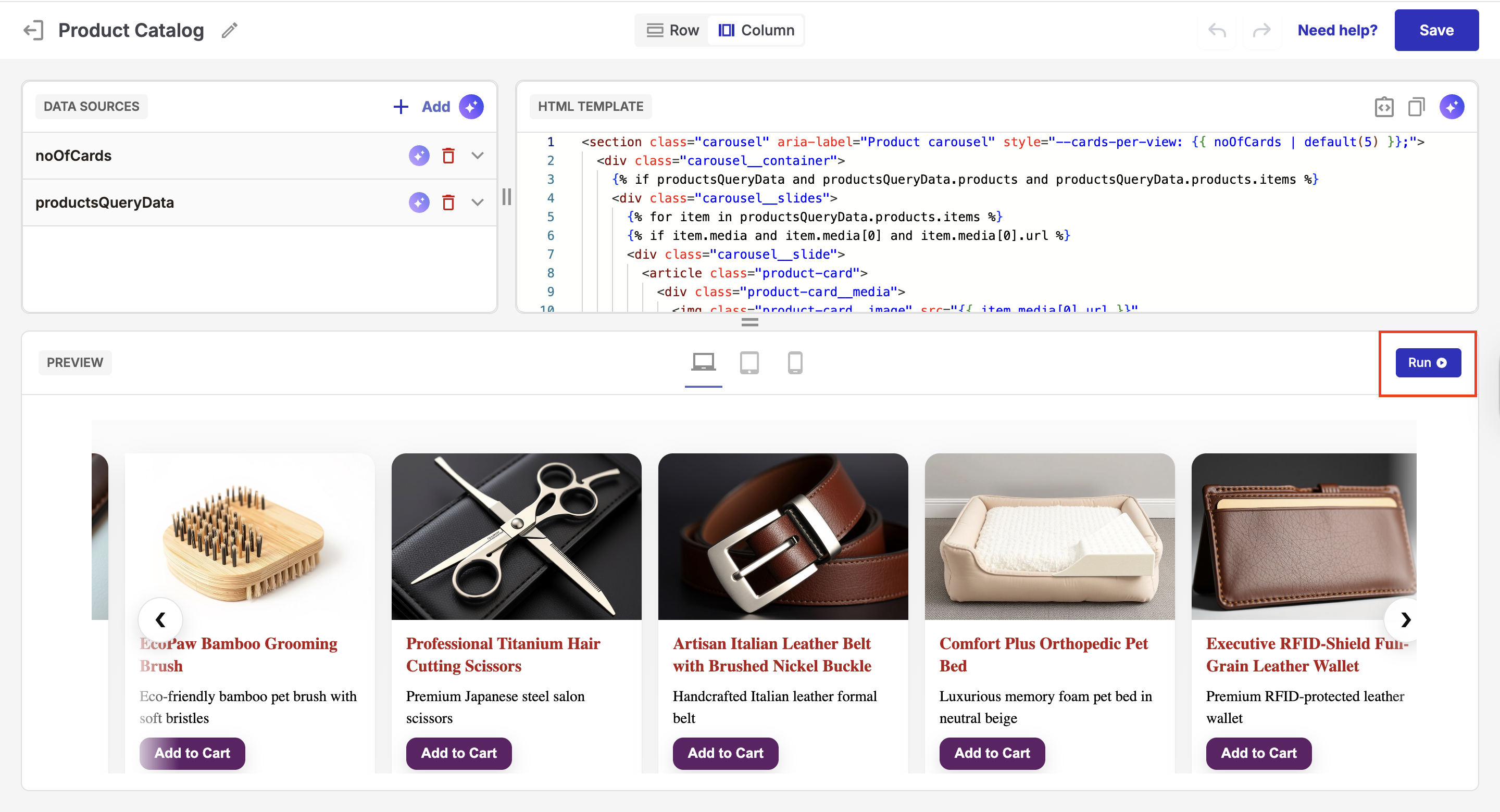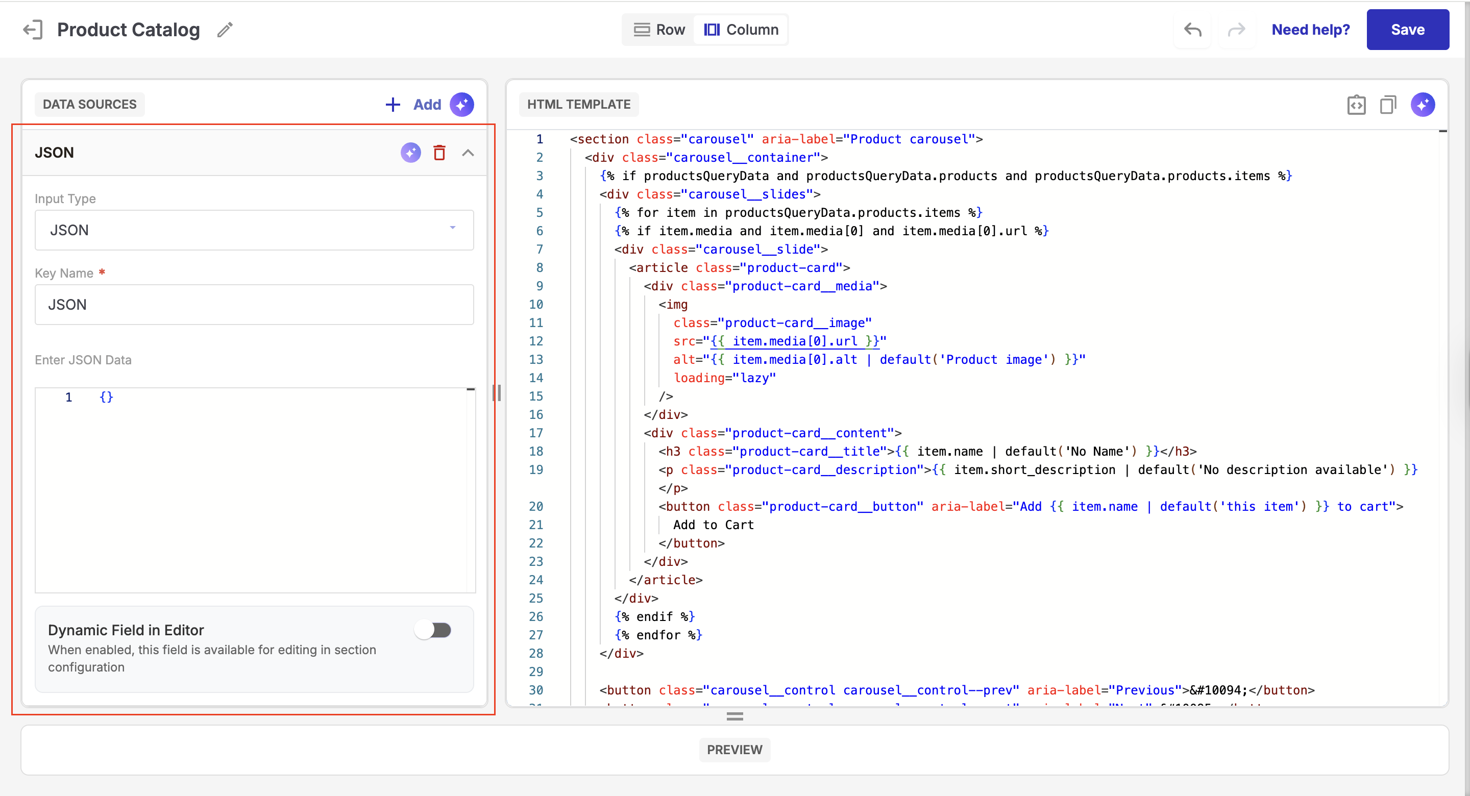 Merchants of all coding skill levels can create bespoke storefront page sections using AI from natural-language prompts with optional image guidance. Merchants with coding expertise can further refine the generated code or build sections from scratch using Nunjucks-based HTML templates and rich data sources.
