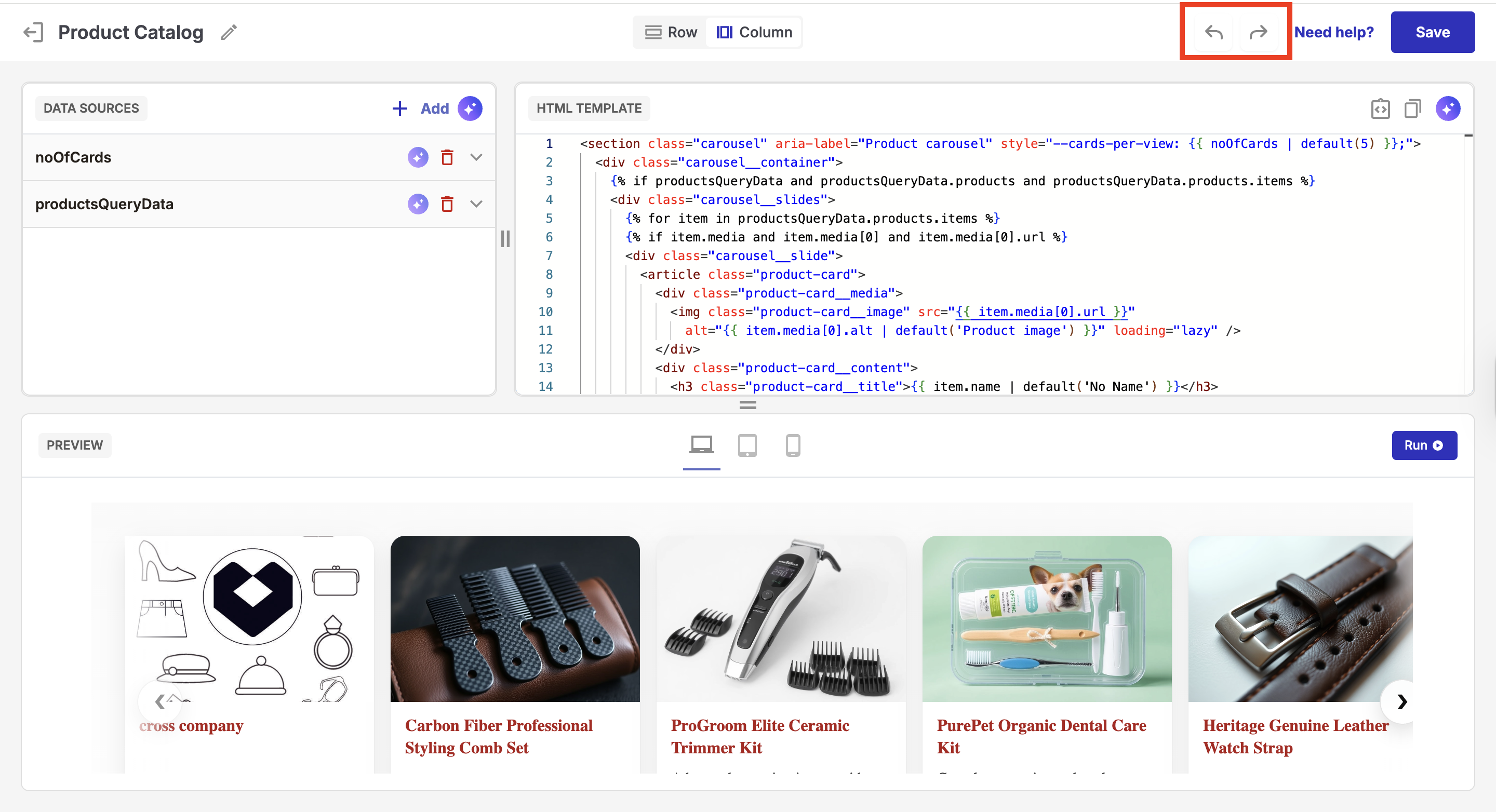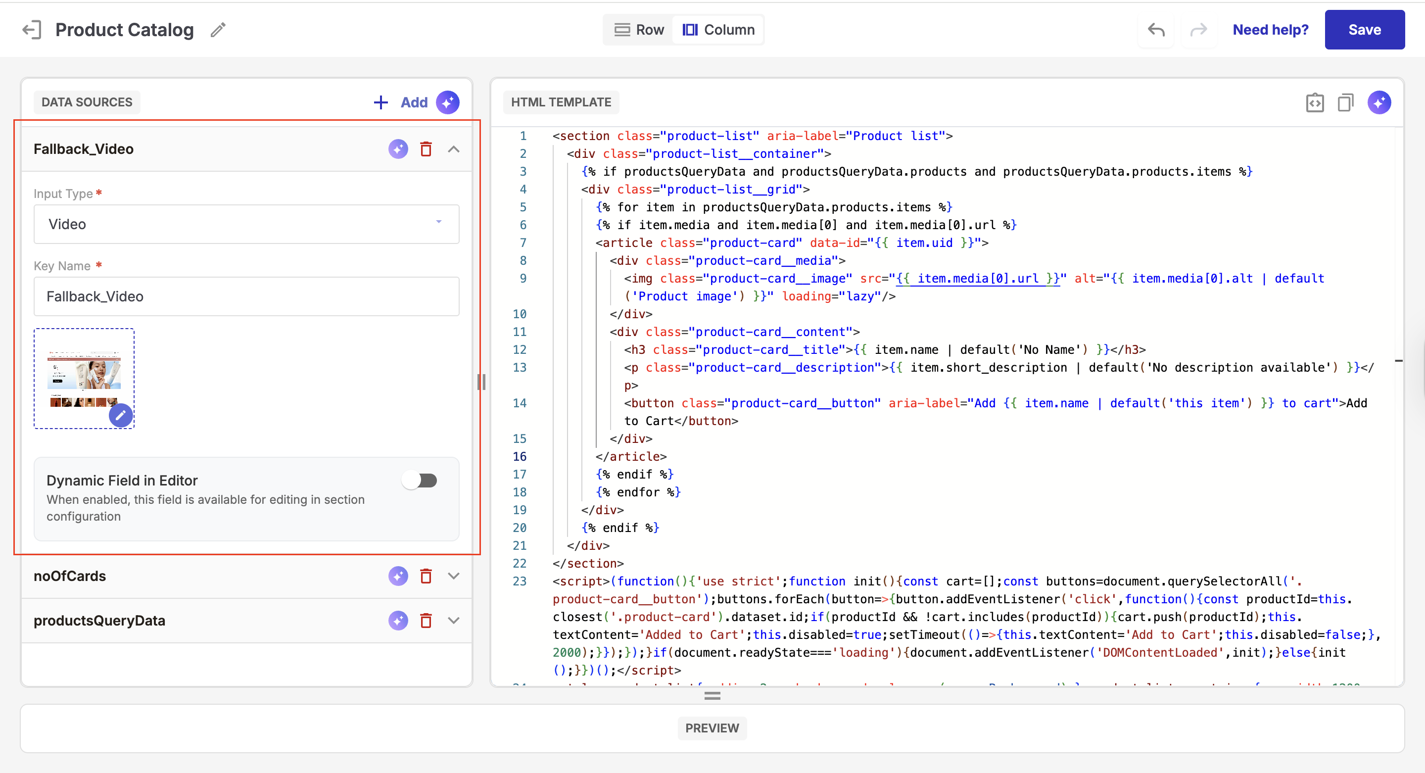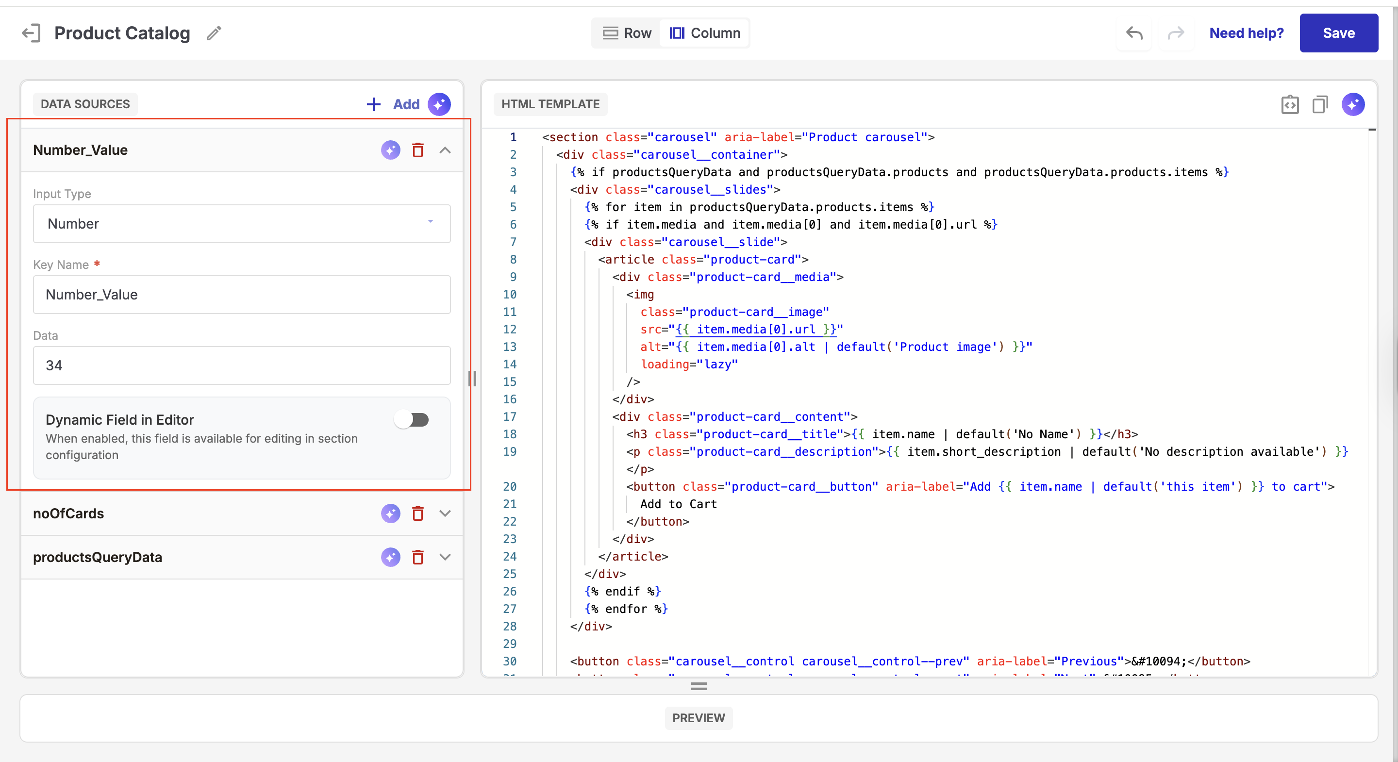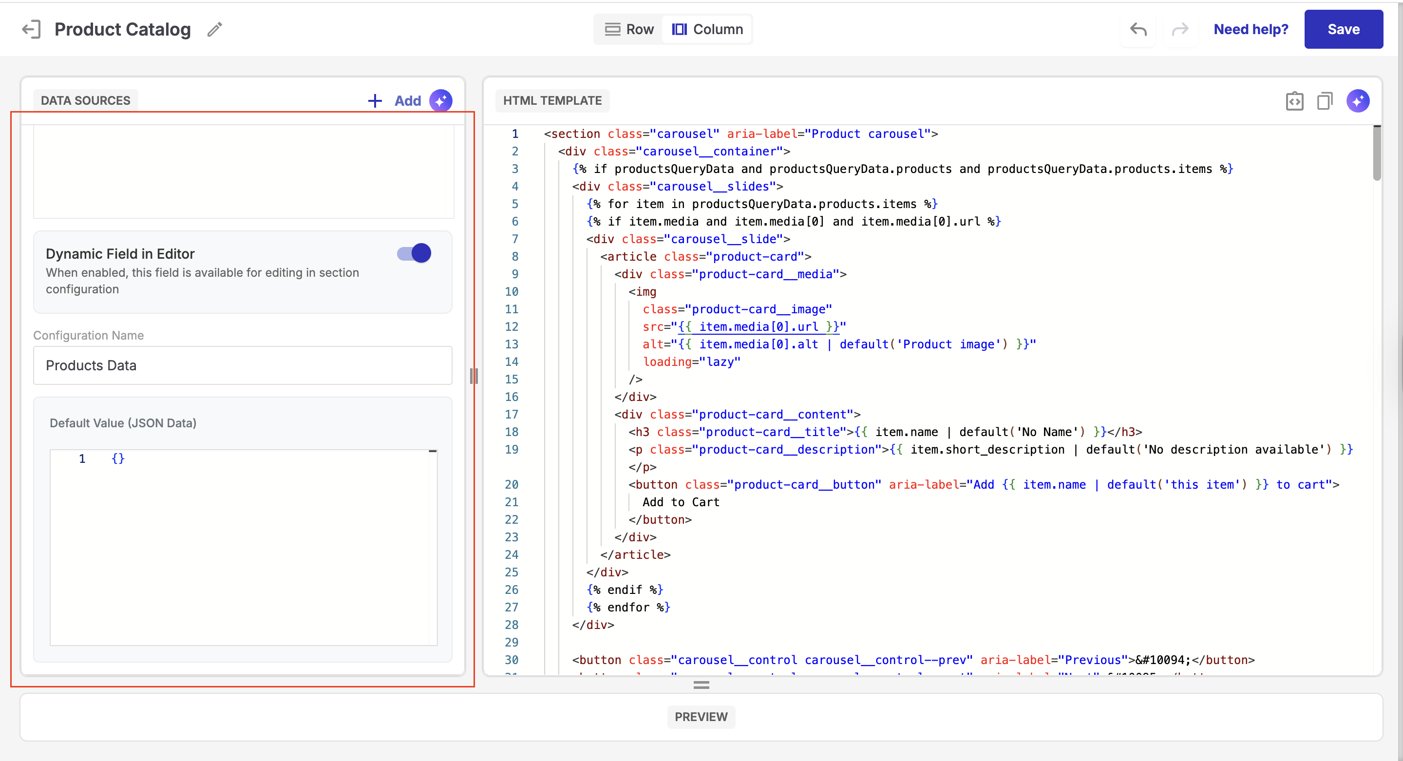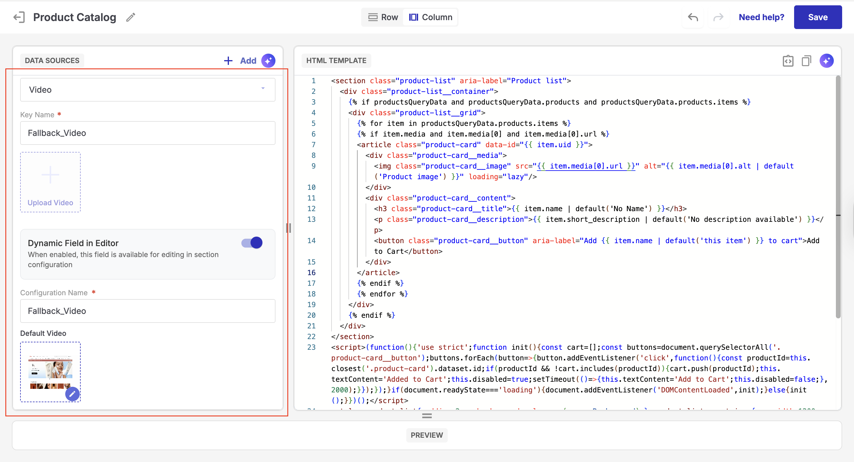 Merchants of all coding skill levels can create bespoke storefront page sections using AI from natural-language prompts with optional image guidance. Merchants with coding expertise can further refine the generated code or build sections from scratch using Nunjucks-based HTML templates and rich data sources.