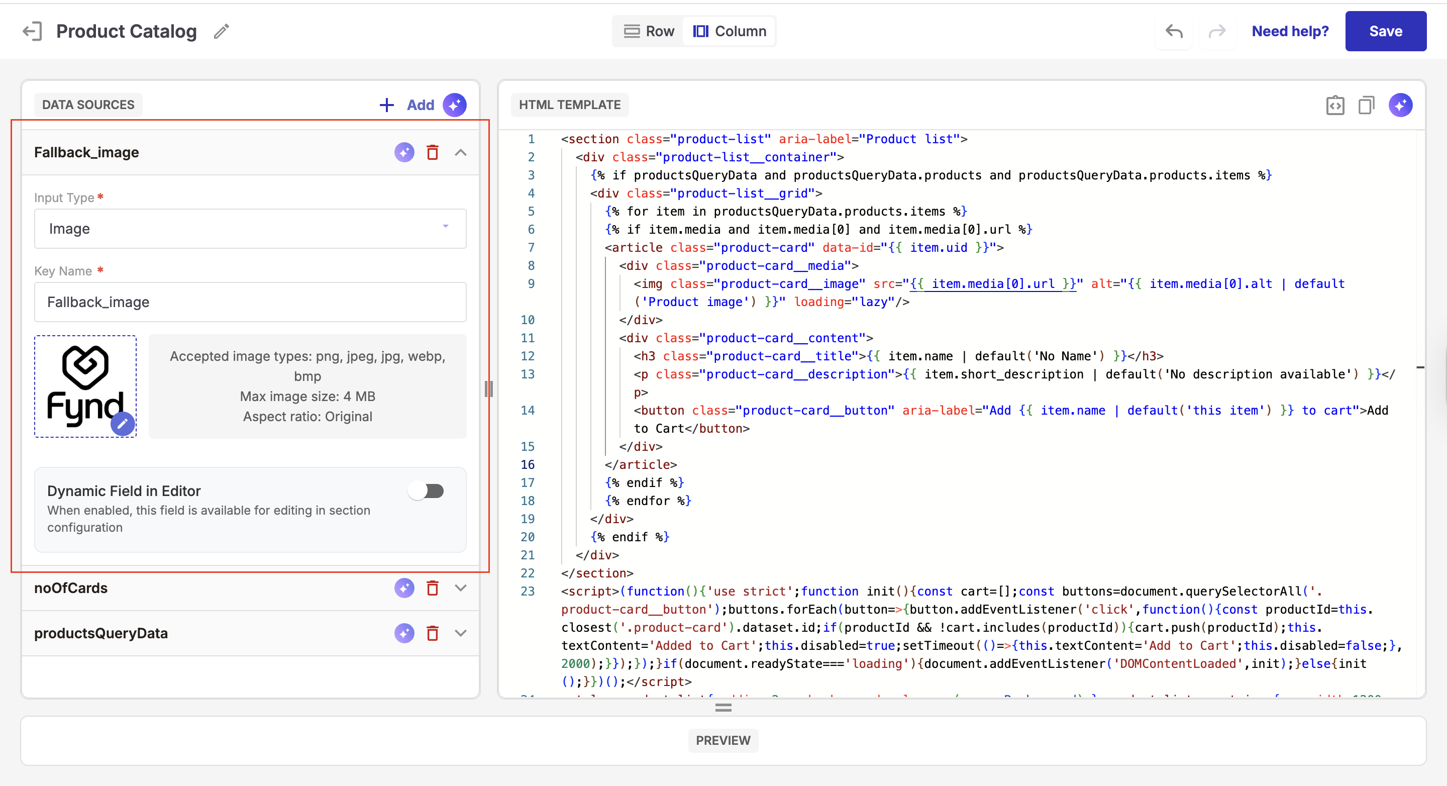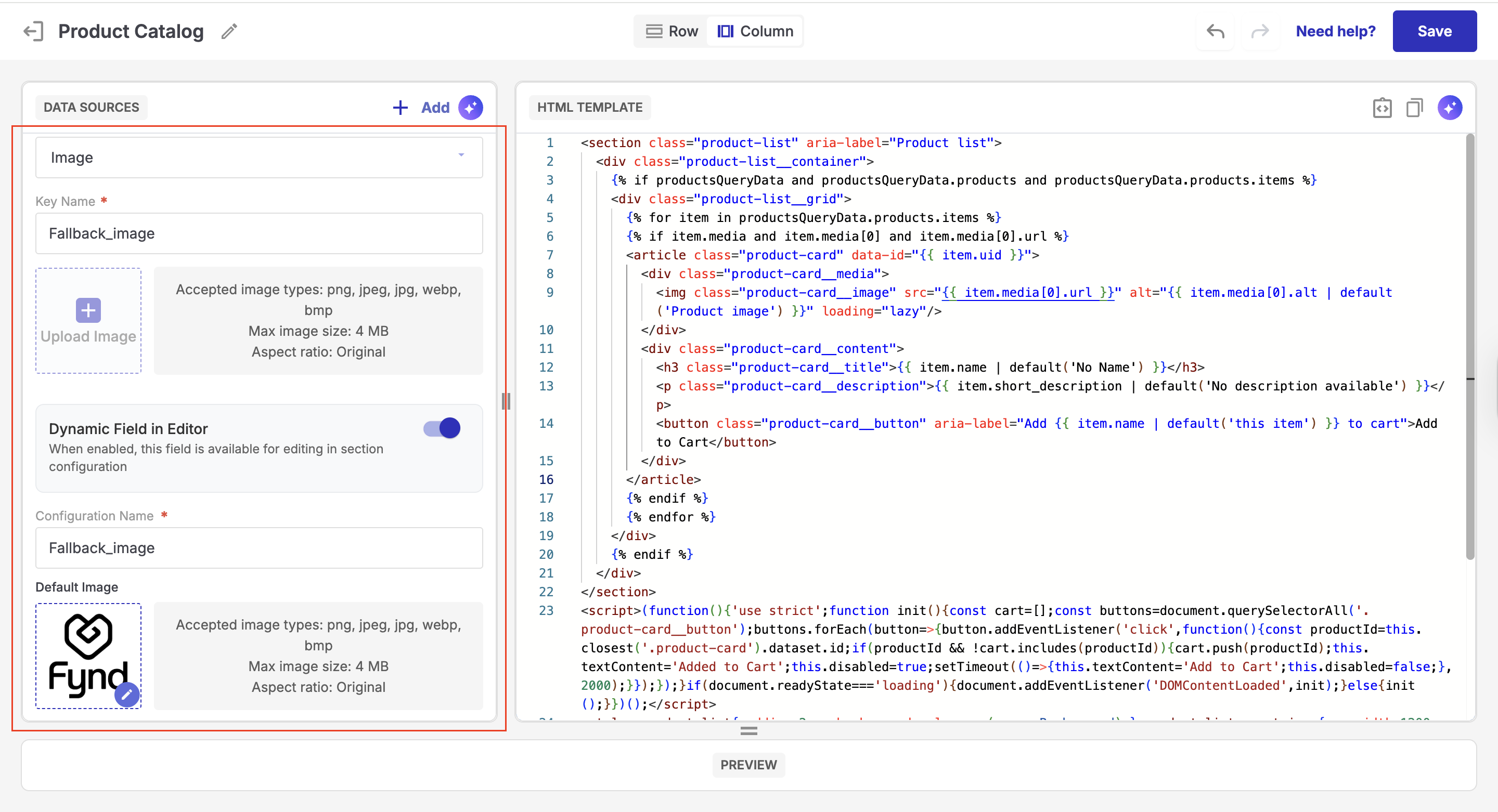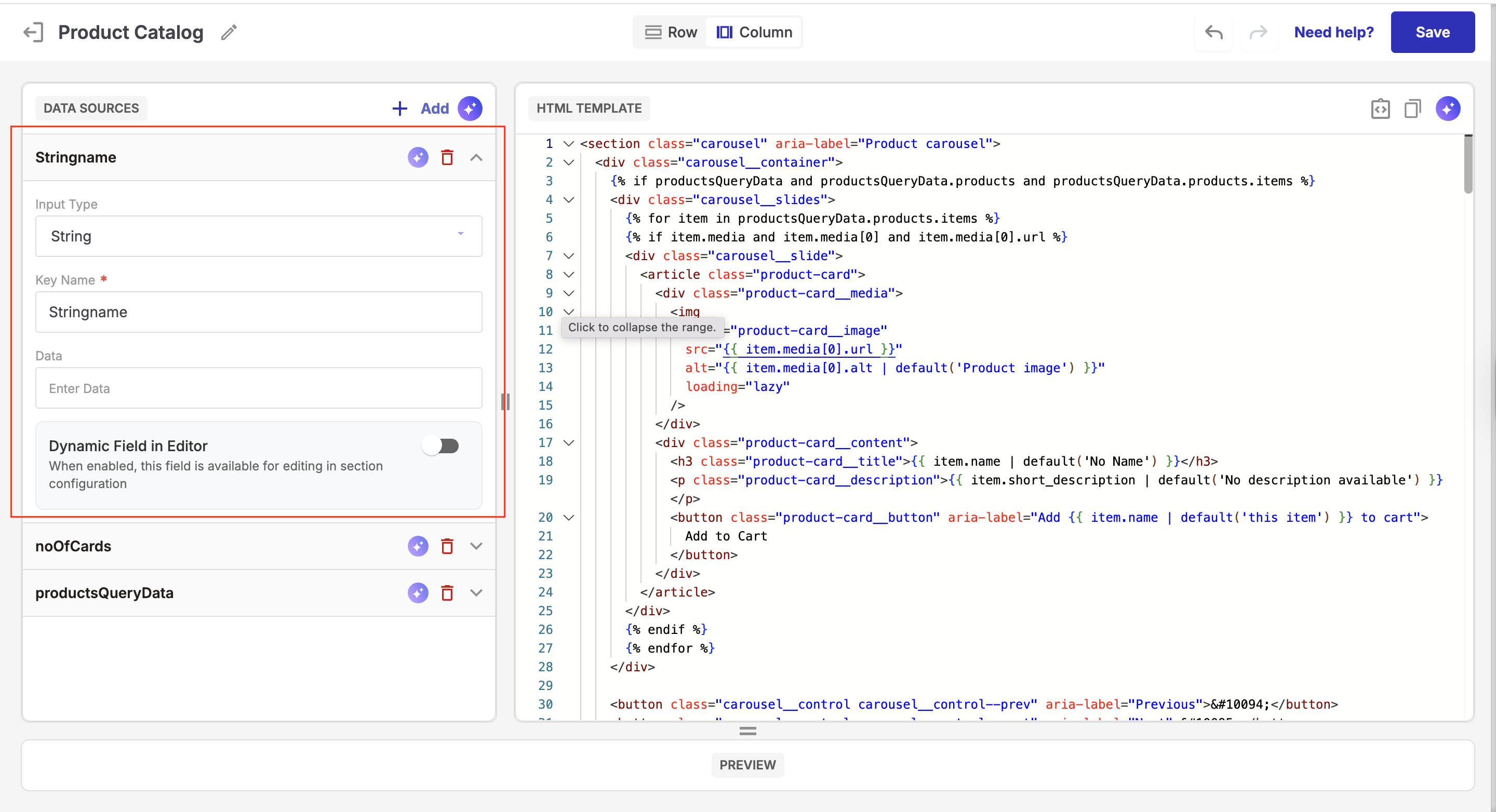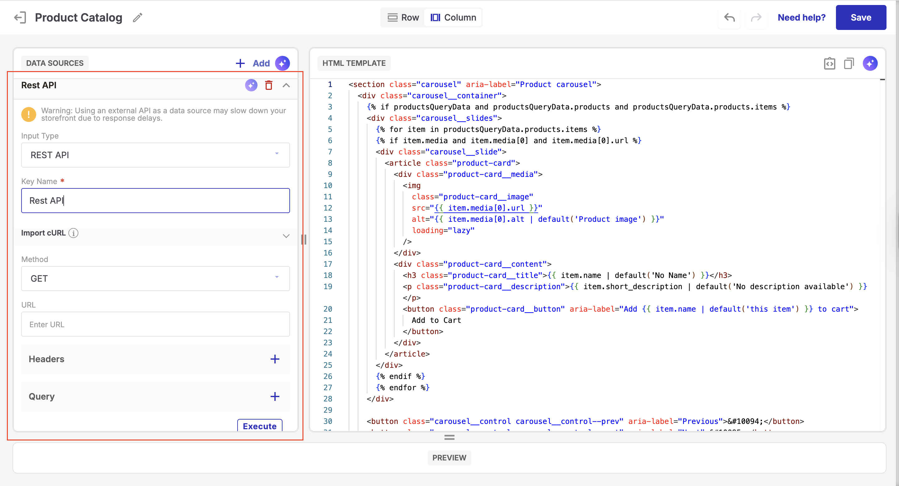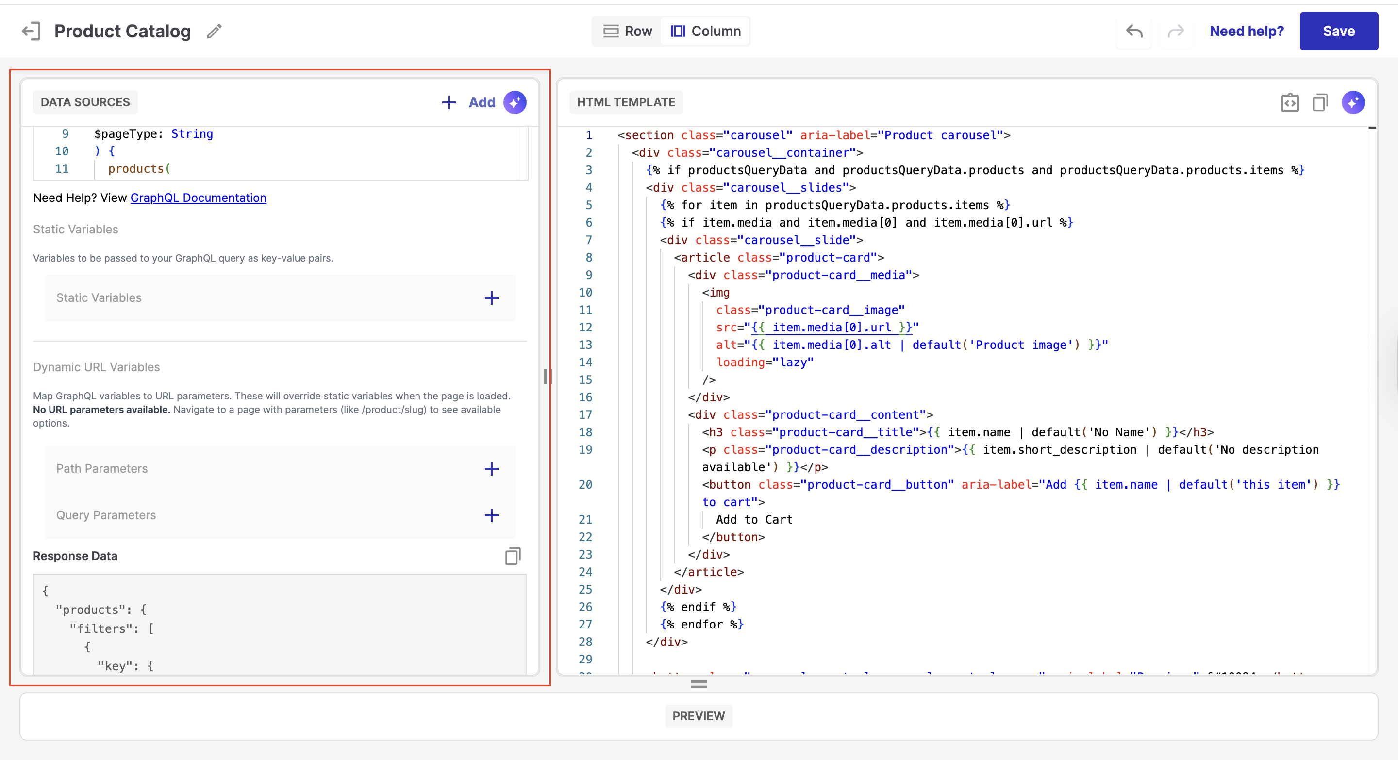 Merchants of all coding skill levels can create bespoke storefront page sections using AI from natural-language prompts with optional image guidance. Merchants with coding expertise can further refine the generated code or build sections from scratch using Nunjucks-based HTML templates and rich data sources.