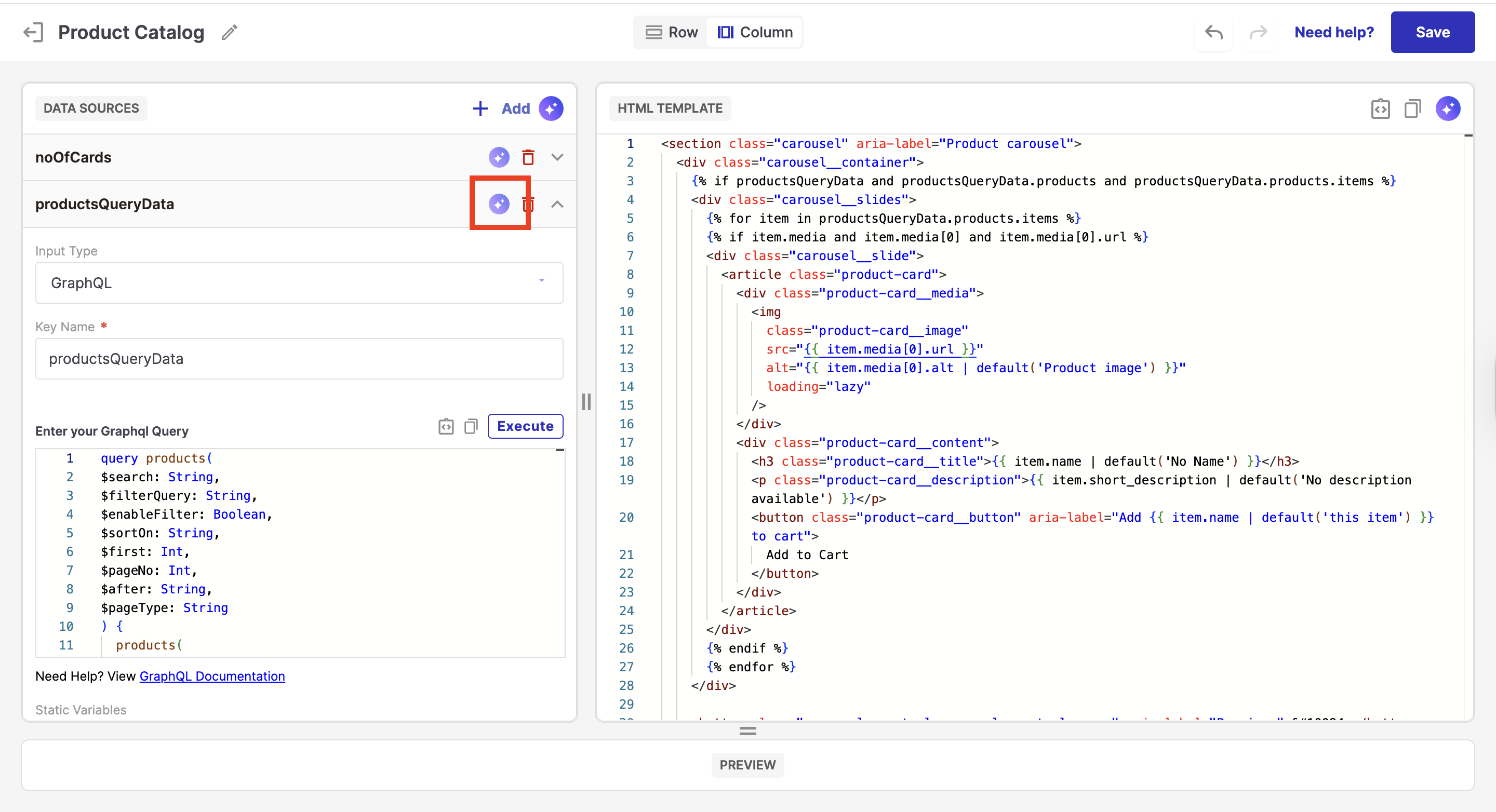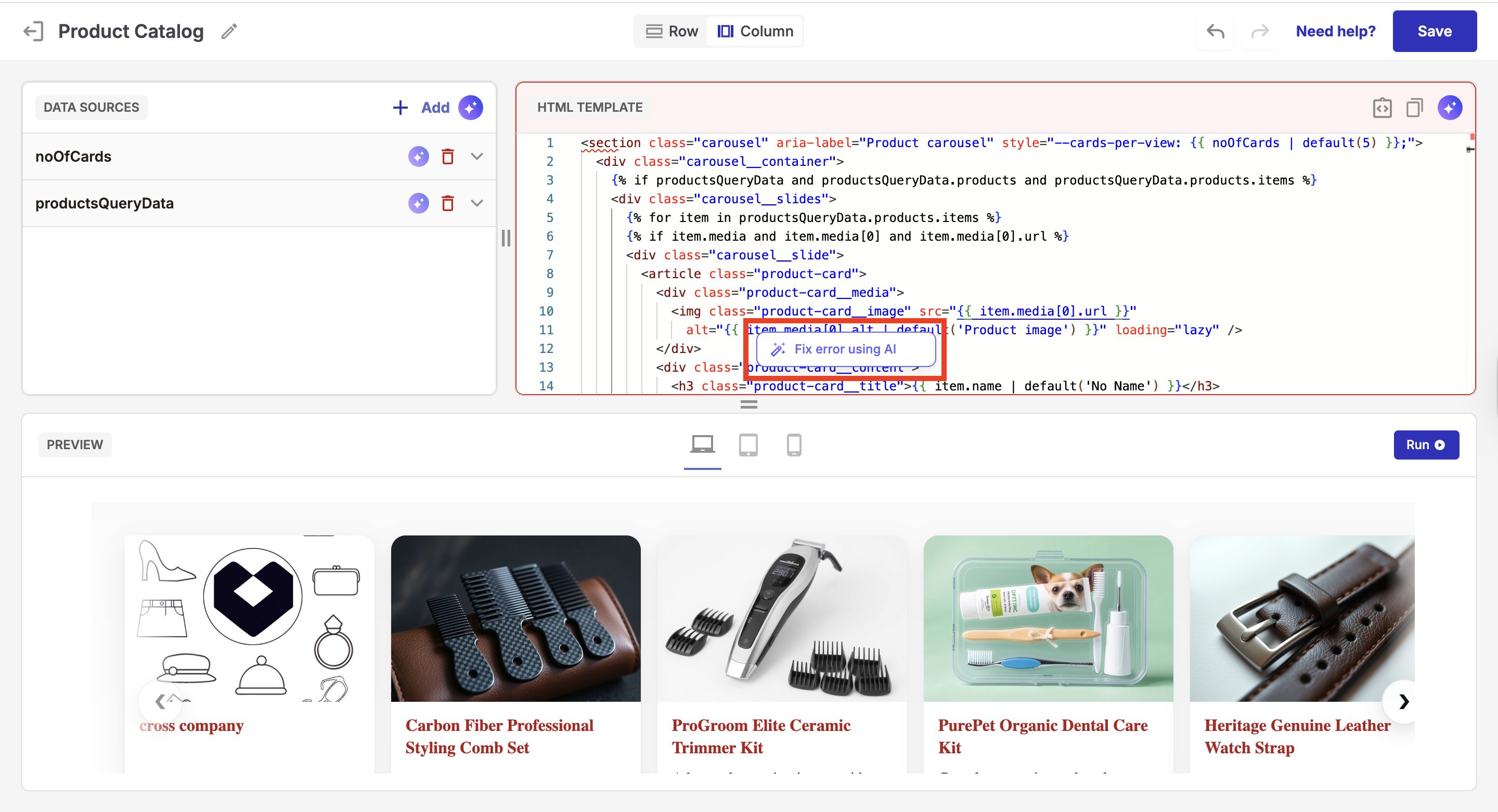 Available across all React themes, this capability uses artificial intelligence to generate the HTML structure, bind dynamic content, and define configurable settings, so that layout and behaviour can be adjusted without changing code. The interface streamlines data binding, styling, and live preview for faster iteration.