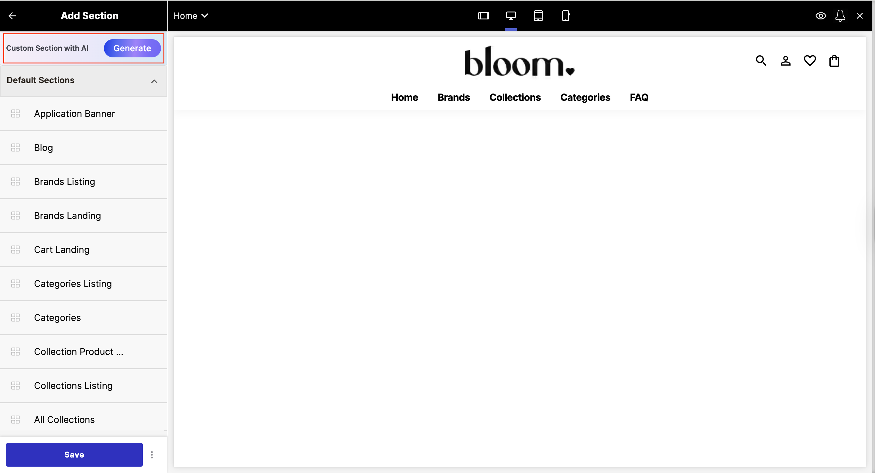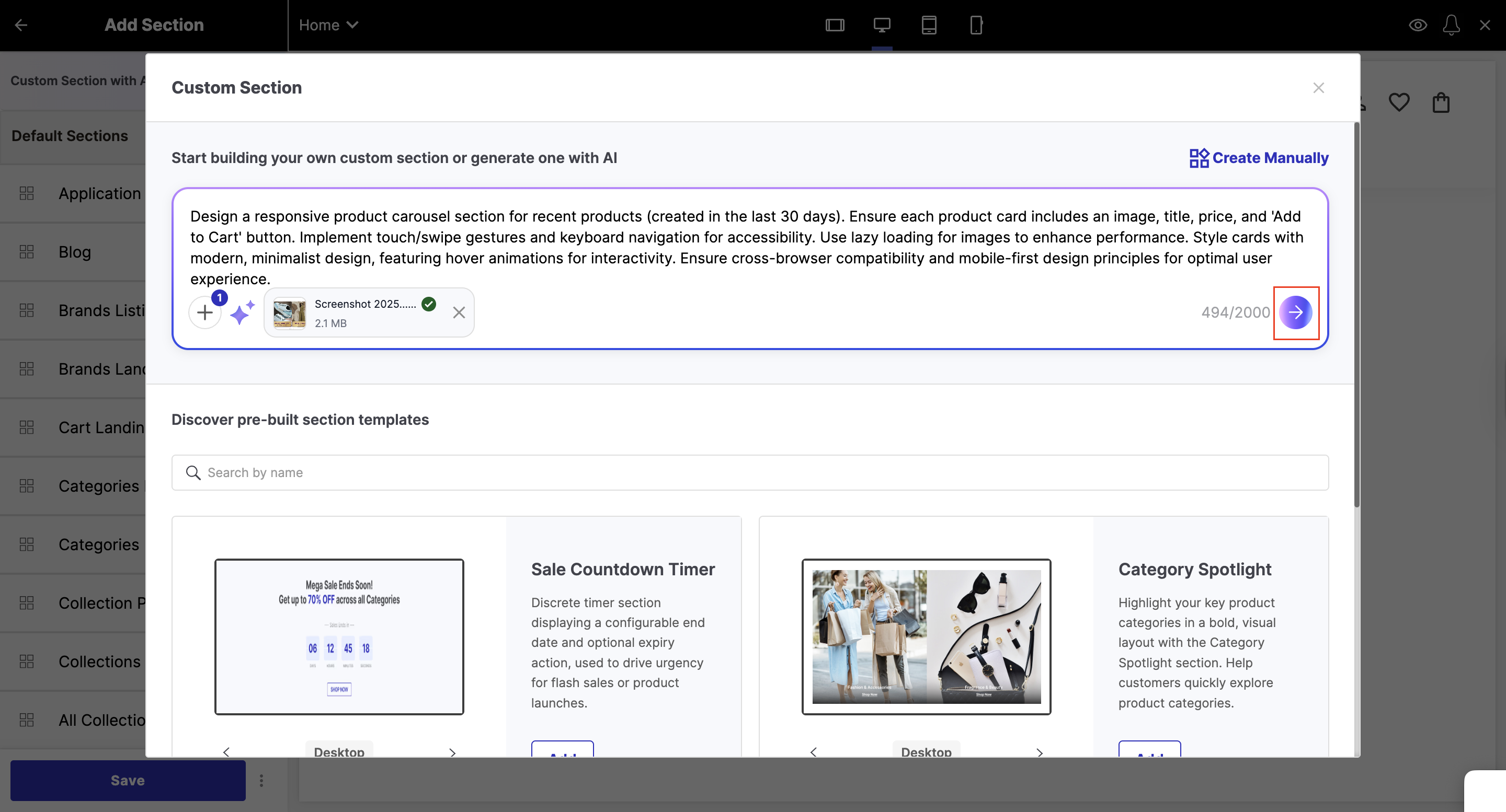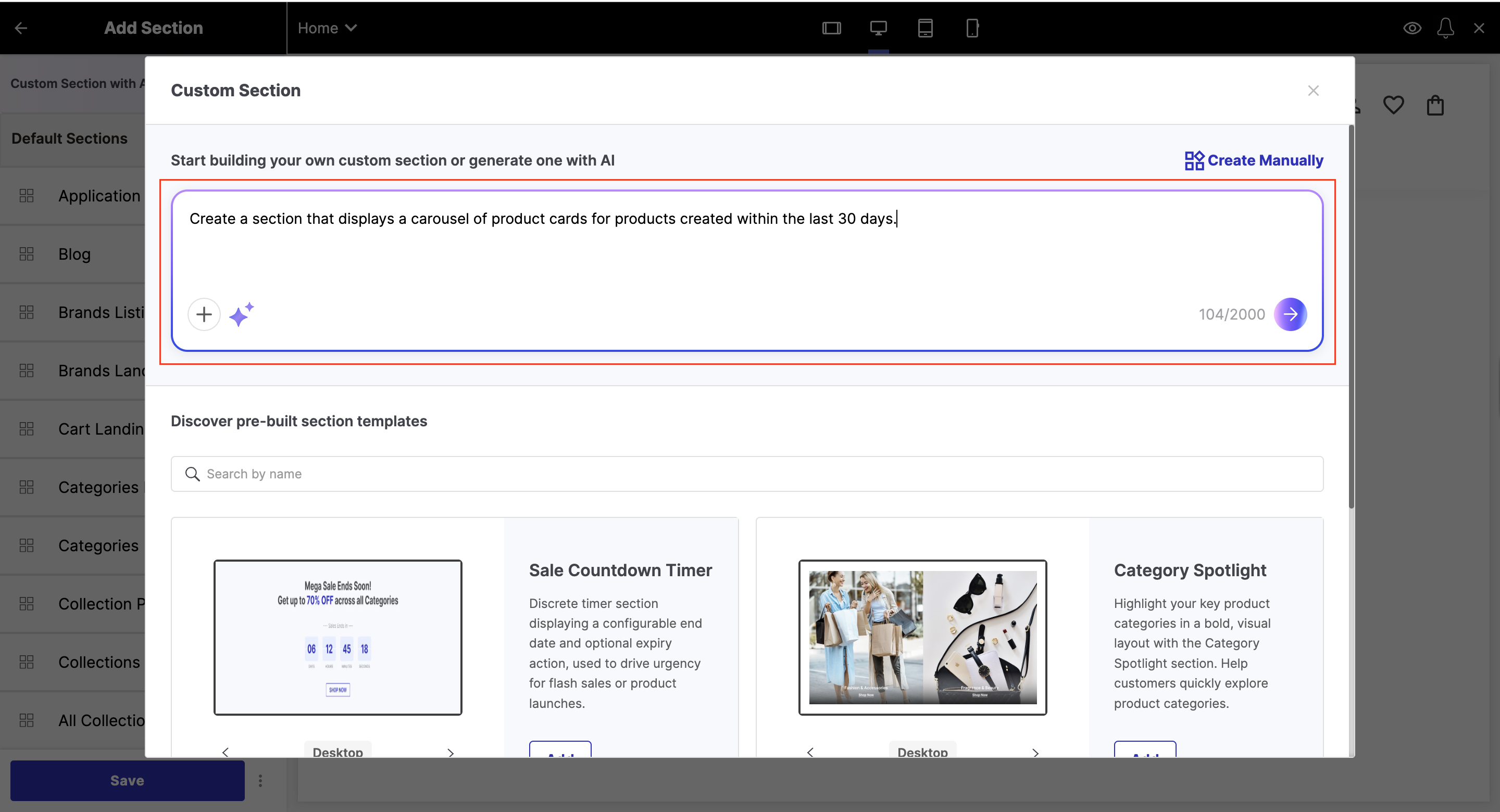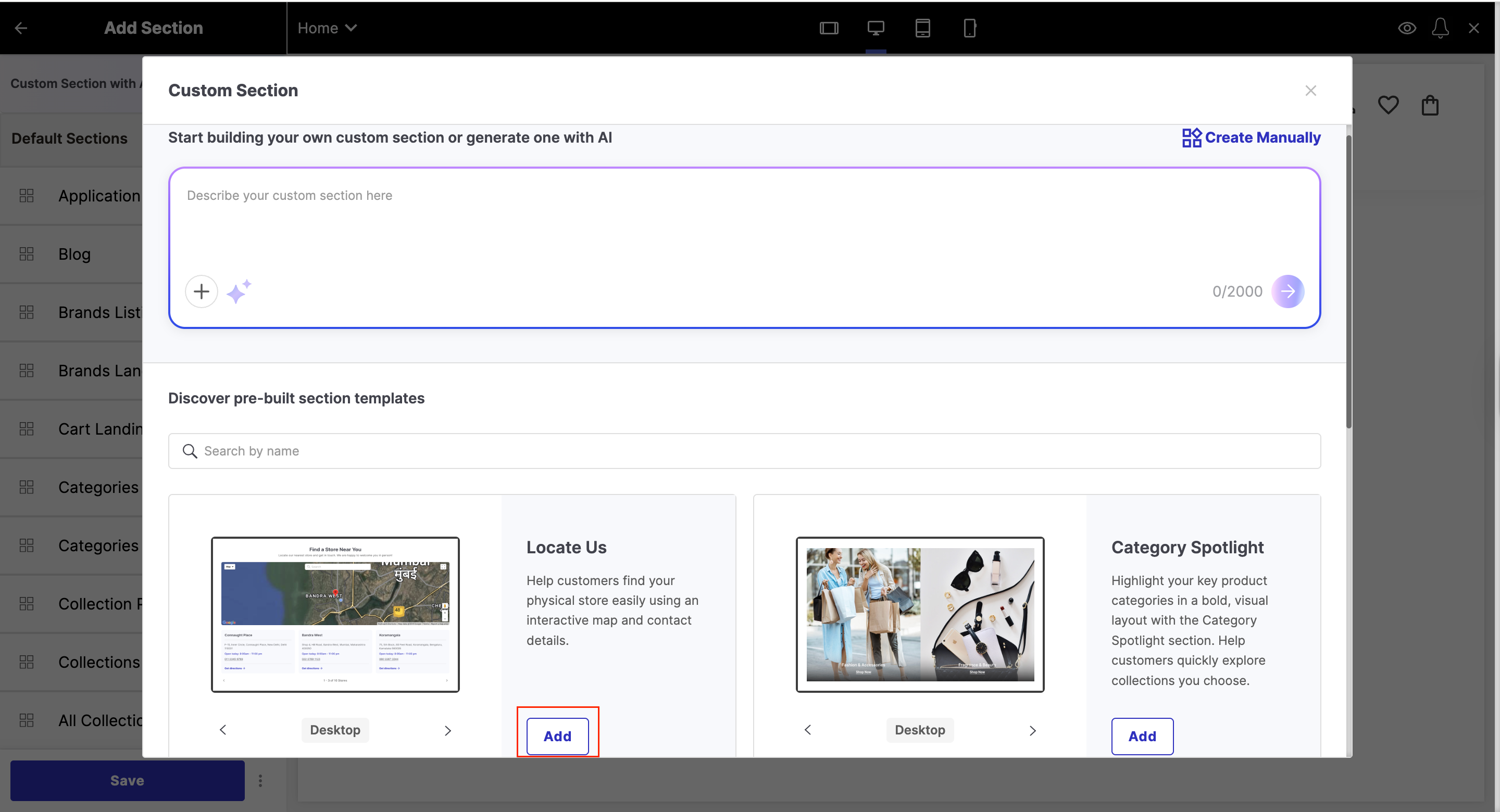 - You can then create create your own custom section or add pre-built section templates from the storefront library to your storefront.