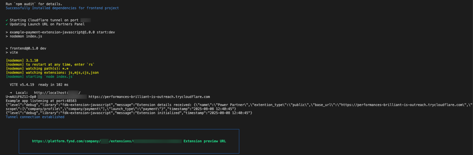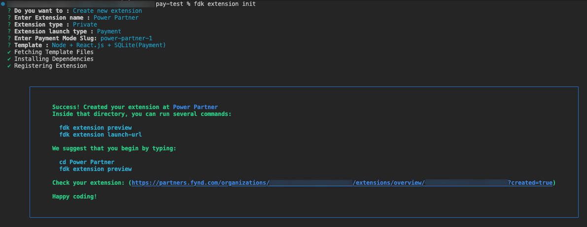 as your preferred technology stack for the template. This will create a boilerplate directory in your local system, and a payment extension will be registered in Fynd Partners. The extension URL will appear in your terminal.